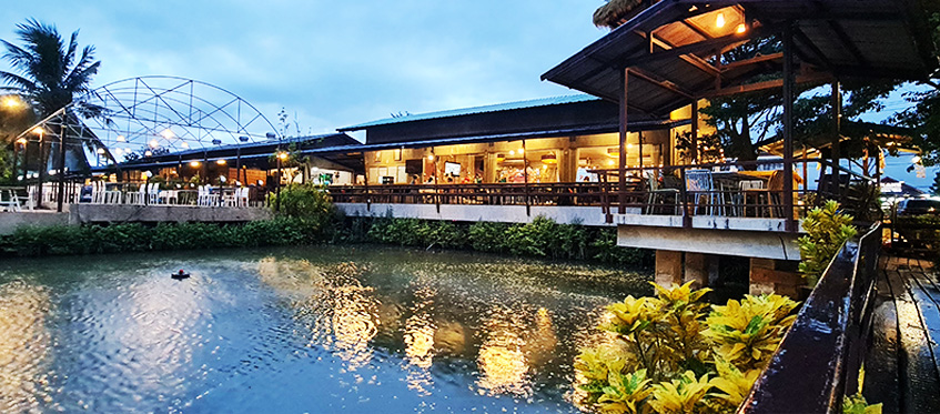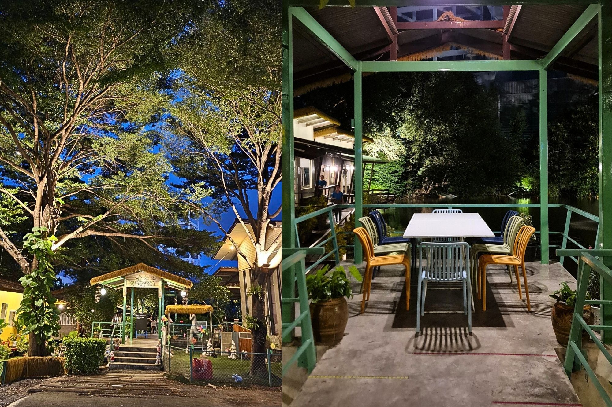 และหลบแสงแดดยามเย็นได้เป็นอย่างดี ภายในร้านมีอาคารตั้งขนานกับสระน้ำ