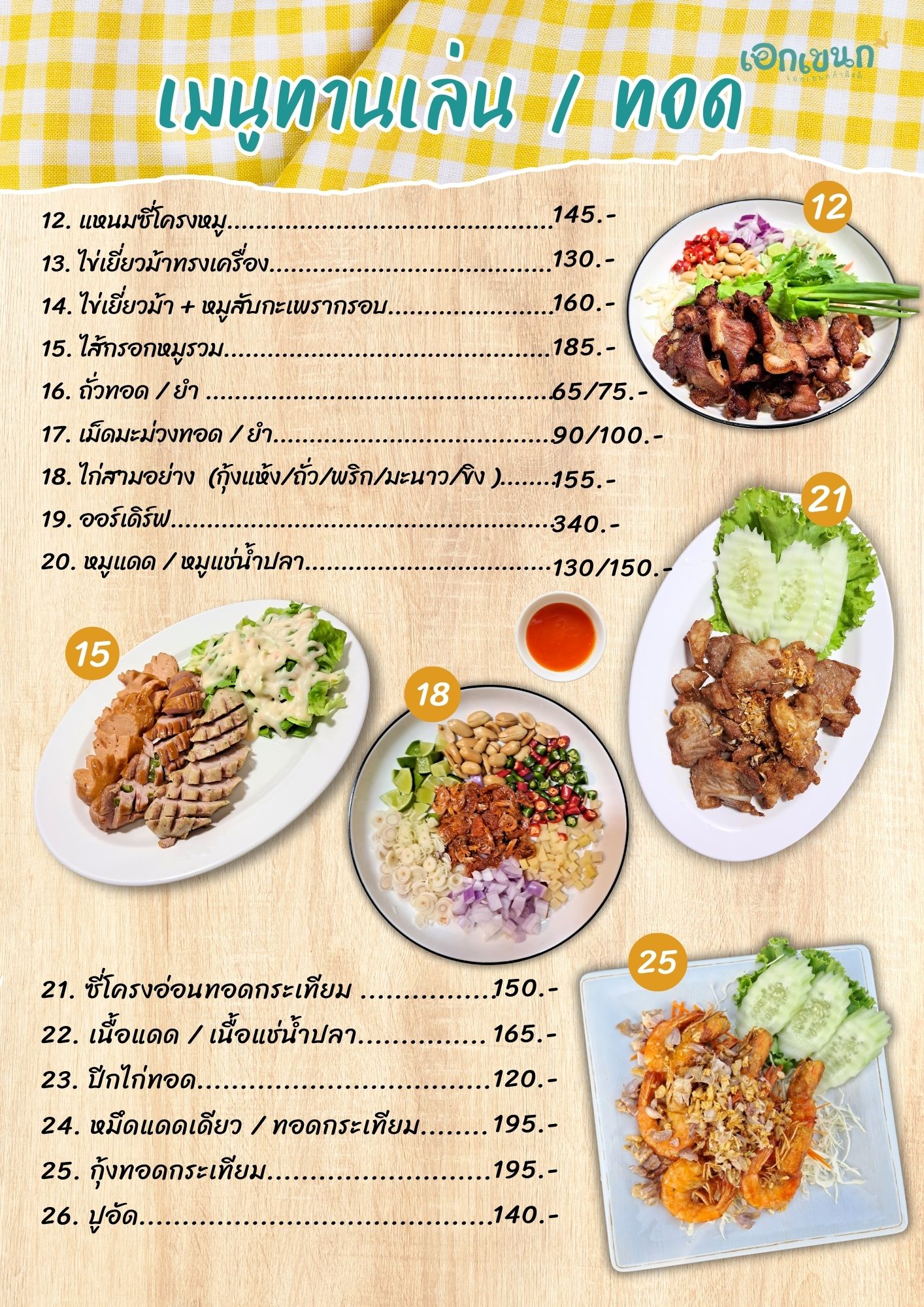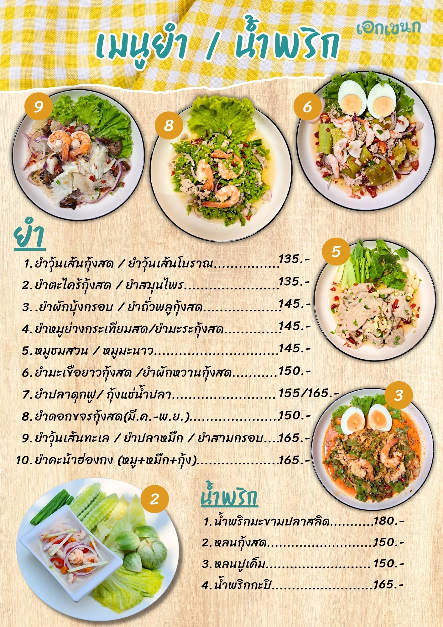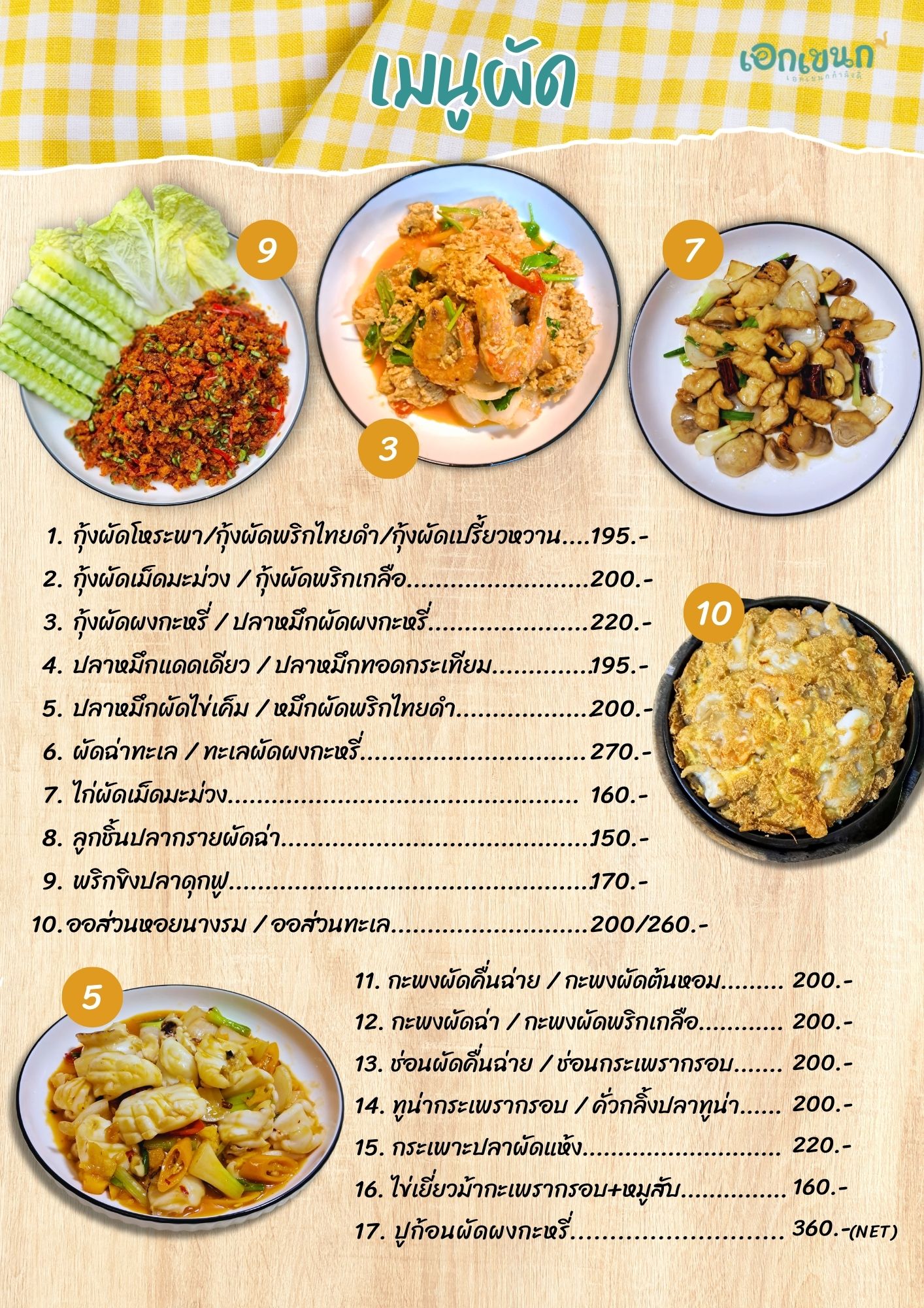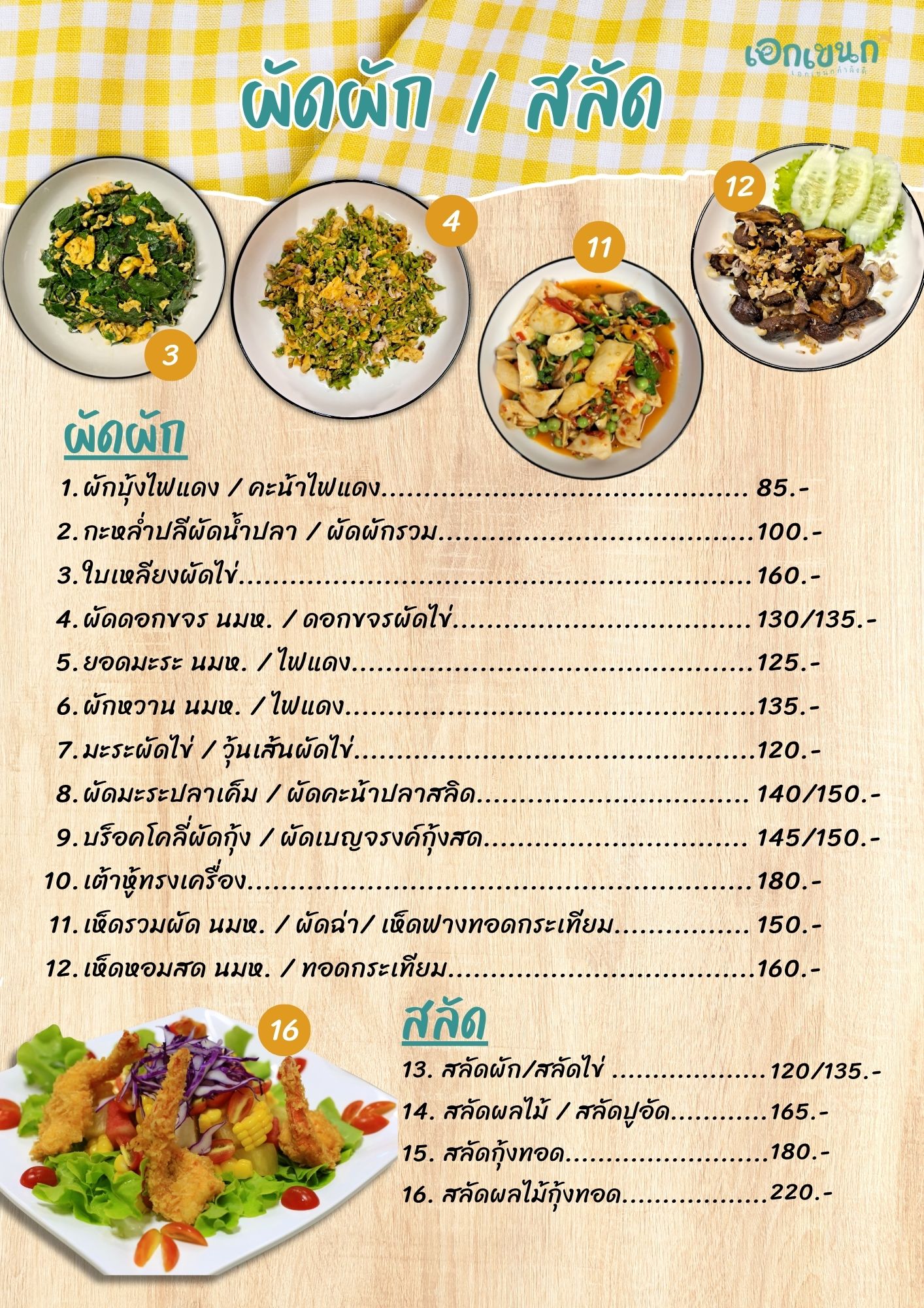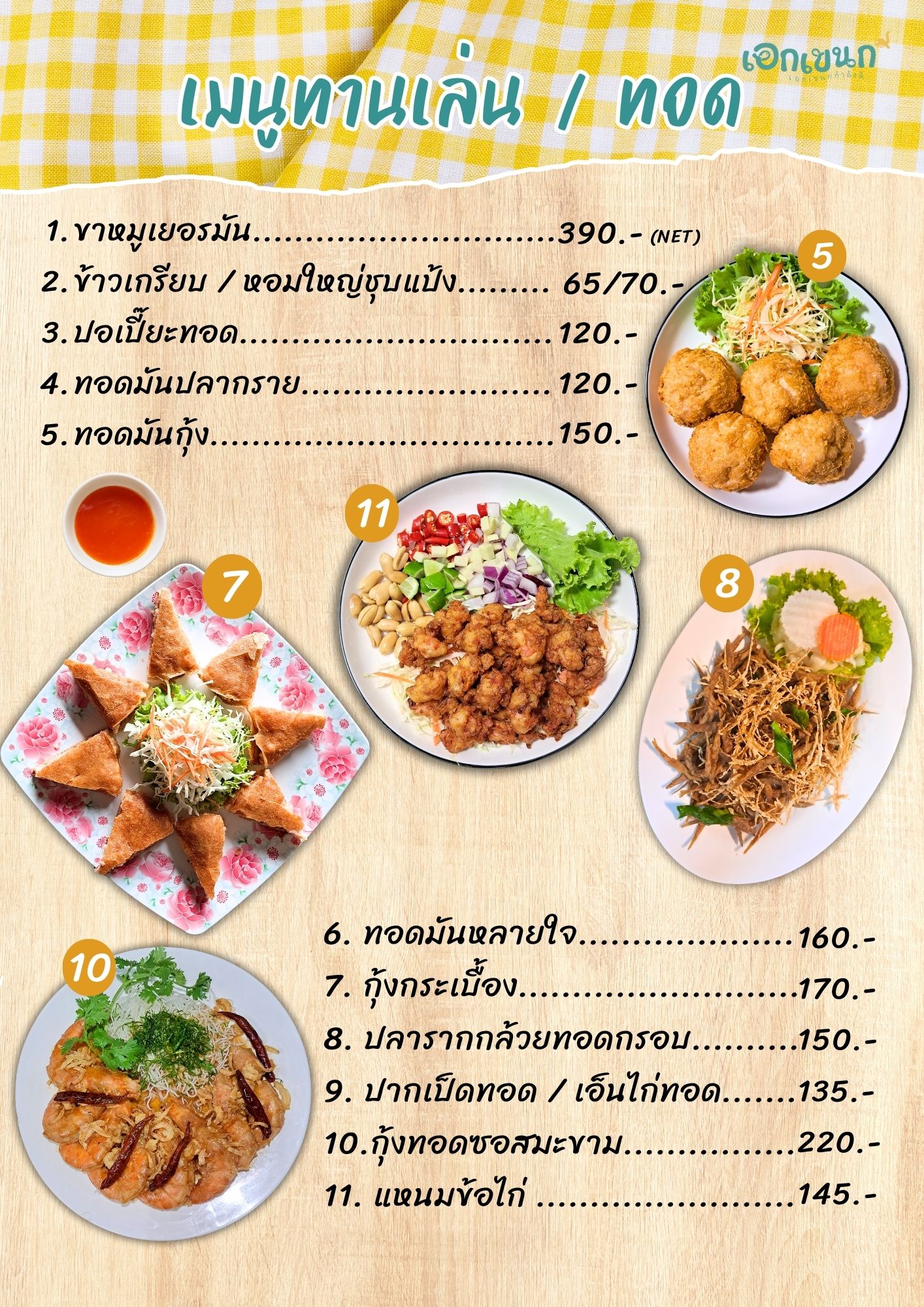 เมนูจานเด็ดจากทีมงานครัวที่มีประสบการณ์กว่า 20 ปี การคัดสรรวัตถุดิบที่ละเอียดรอบคอบเป็นที่มาของความสดอร่อยในอาหารทุกจานของบ้านเอกเขนก กรณีจองห้องจัดเลี้ยง หรือคาราโอเกะ กรุณาสั่งอาหารล่วงหน้าอย่างน้อย 1 วัน และระบุชื่อผู้จอง, เบอร์โทร, วันที่ใช้บริการ ลงมาในเอกสาร FAX เพื่อความสะดวกรวดเร็วค่ะ เบอร์ FAX. 02-501-7899